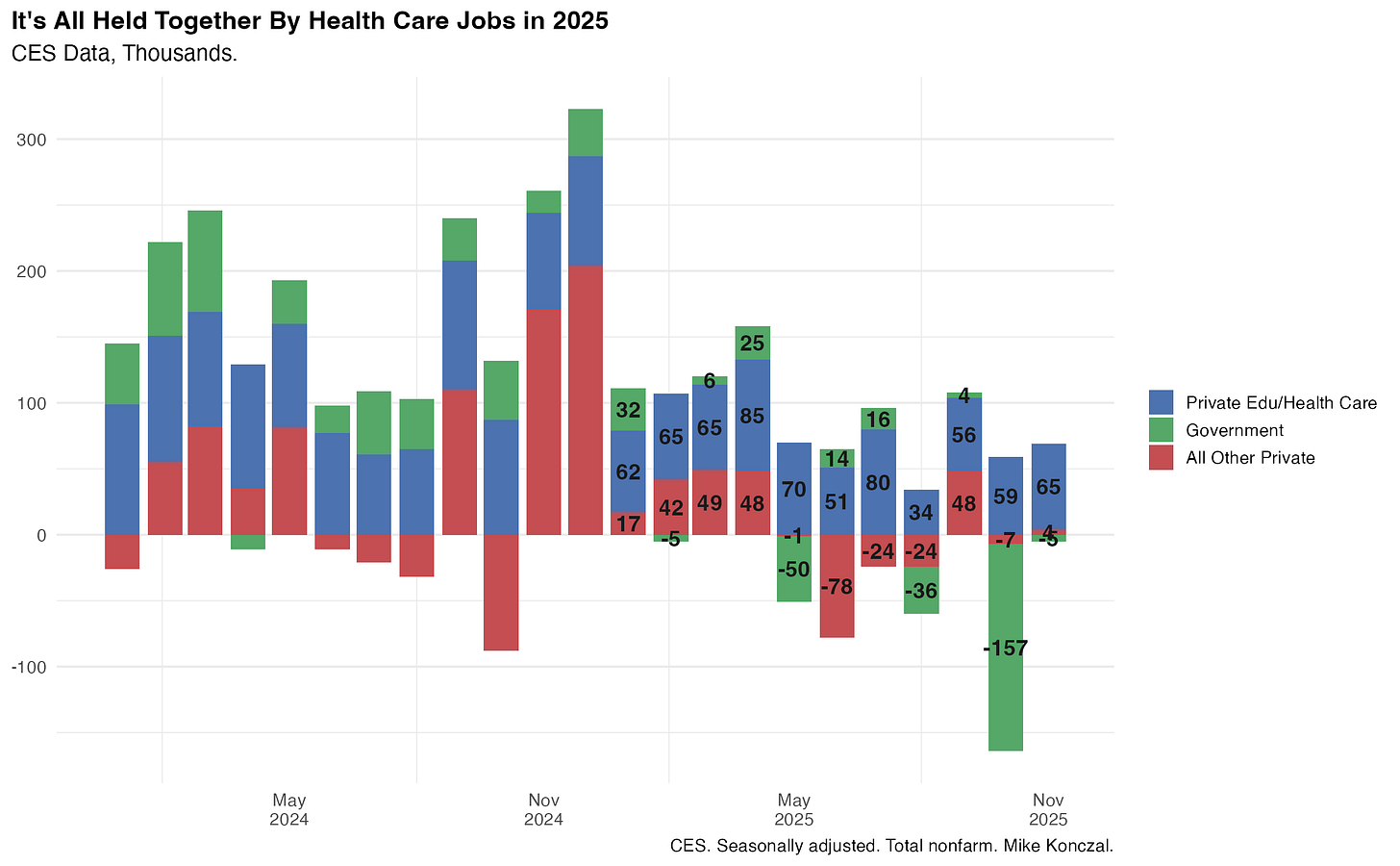 Health care continued to do the heavy lifting, while the rest of the labor market collapsed. The promised handoff from government-adjacent employment to private-sector dynamism never materialized.