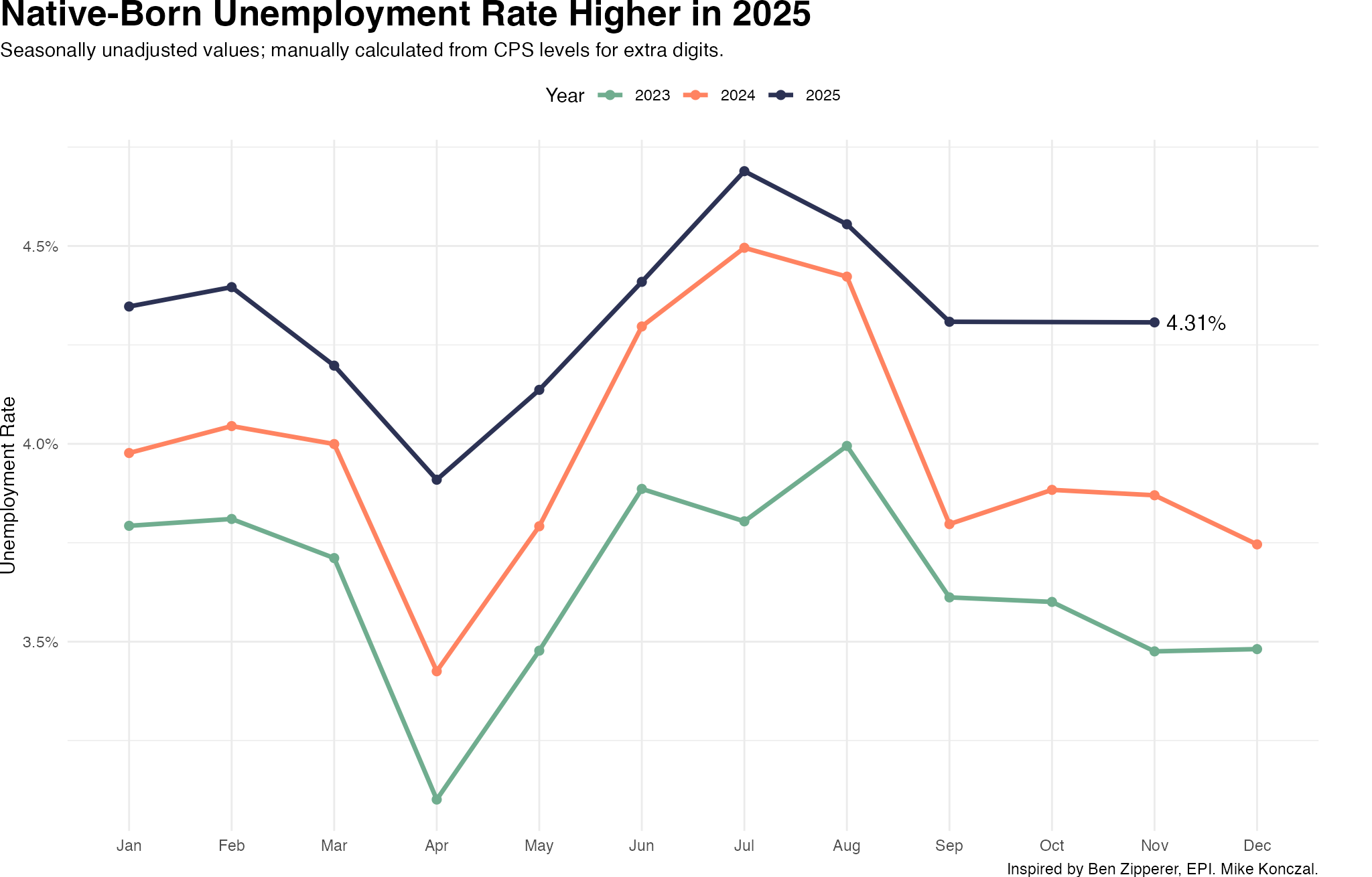As shown above, it’s a worse year for native-born workers with their unemployment up. The administration believes that employment is a zero-sum competition between groups. But the evidence points to a shared exposure, to both prosperity and, as we’re now experiencing, to rising joblessness amid weakening demand and policy confusion.