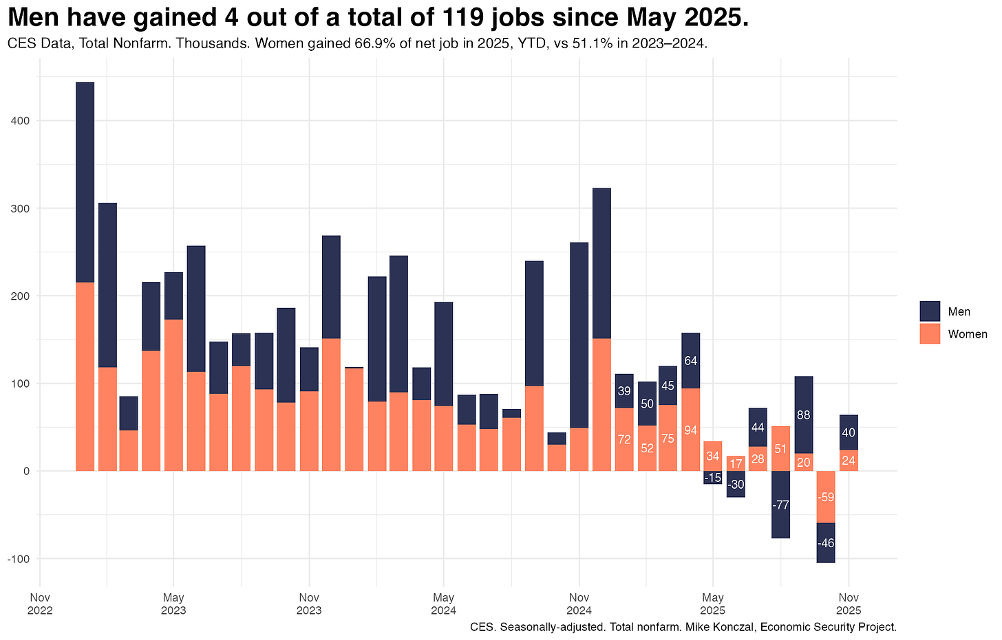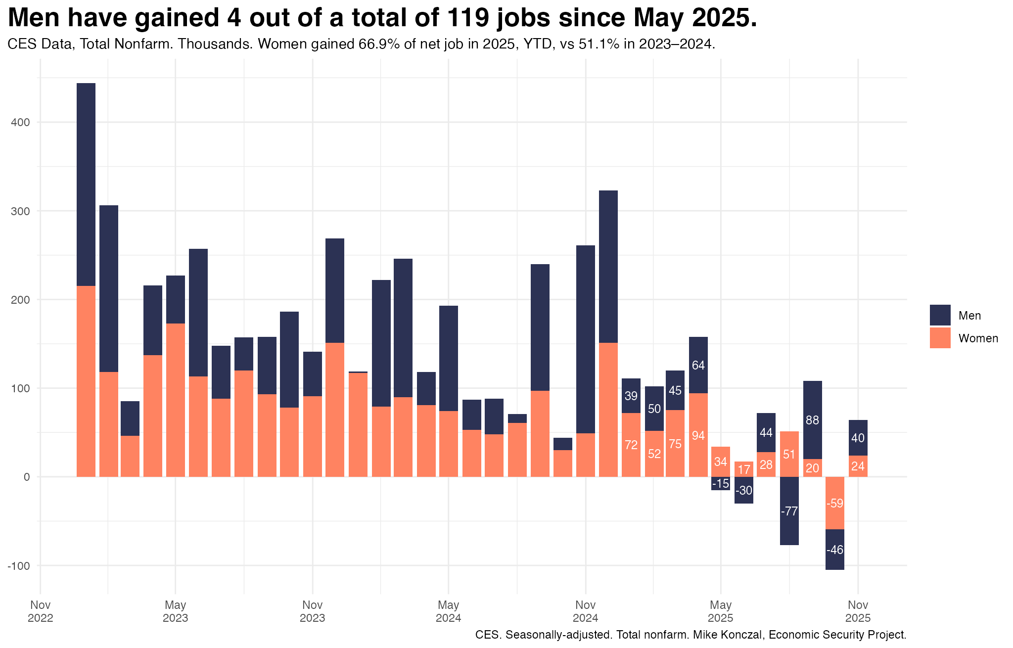 However, that’s not happening. With goods weakening and health care holding the labor market together, Trump has made it a worse environment for male employment. Starting in May, right after Liberation Day, men have gained 4,000 out of a total of 119,000 new jobs. Overall in 2025, women have gained 67% of jobs, compared to 51% in 2023 to 2024. The labor market is moving in the opposite direction of the one this theory requires.