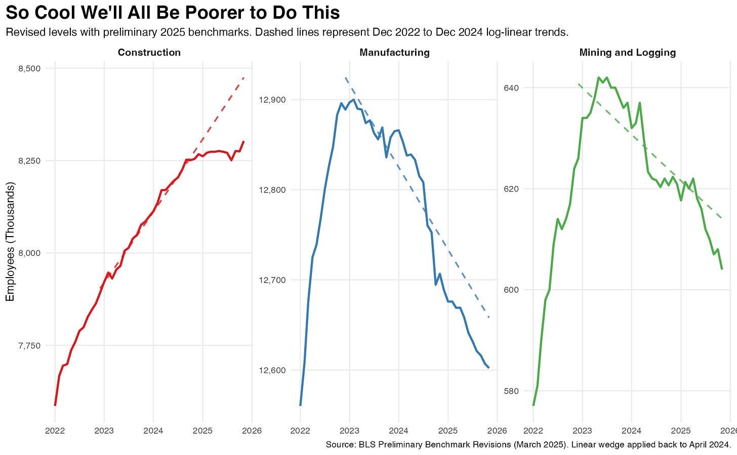 Here is the data for 2025 with trend lines from December 2022 to 2024. I incorporate the preliminary annual BLS benchmark revision, which aligns monthly payroll estimates with more accurate administrative employment counts, to the earlier data, reducing 2024 job gains. (Data pulls and estimates here.) There is no visible break from the preexisting trajectory, let alone the beginnings of a resurgence. There’s actually further deceleration. This might be for the best, as goods-producing jobs pay, on average, less than private-sector service jobs. But whatever is meant to happen, it hasn’t started yet.