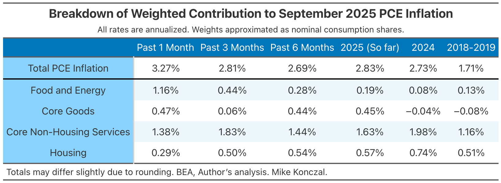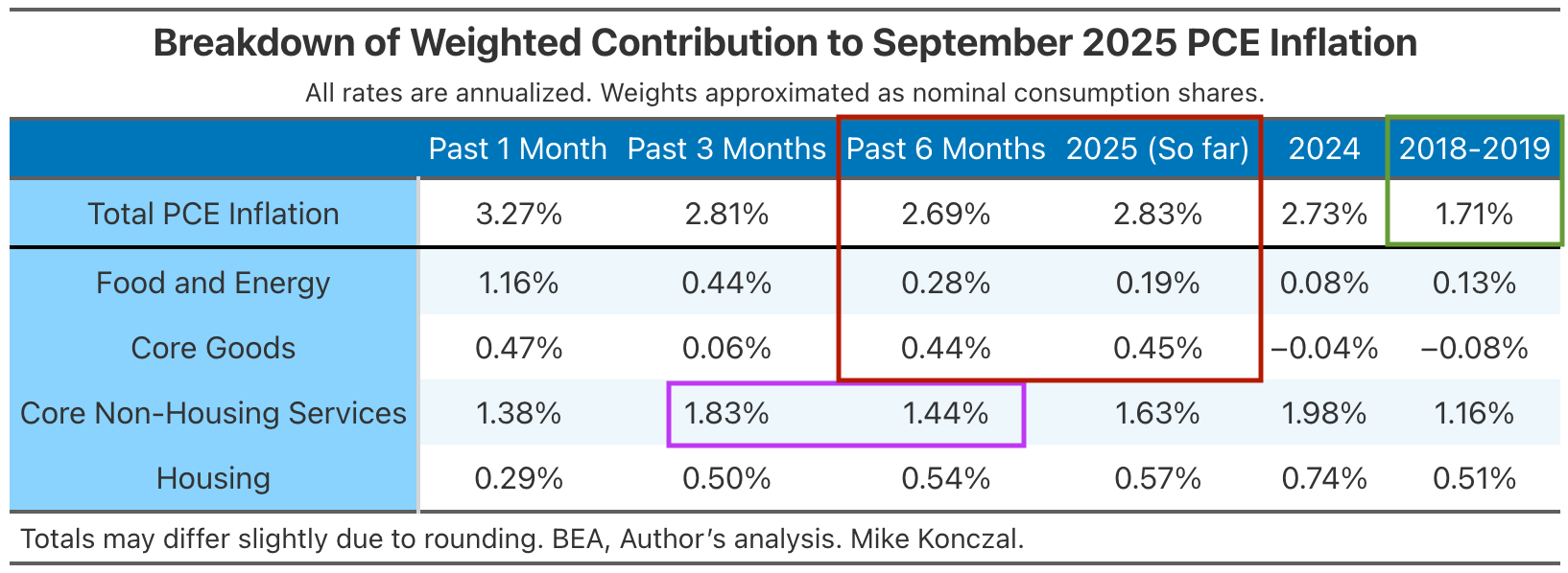 Let’s jump forward to now, and discuss the red-colored box. Over the six months prior to September, inflation was 2.7%. Yet 0.44% of that is in core goods, which was zero in 2024 and zero in 2018-2019, and is largely attributable to the one-time impact of Trump’s tariffs. That puts underlying inflation right at 2.26%. 2.26% is not 2.0%. But 2.26% is not something you should cause a recession to end.