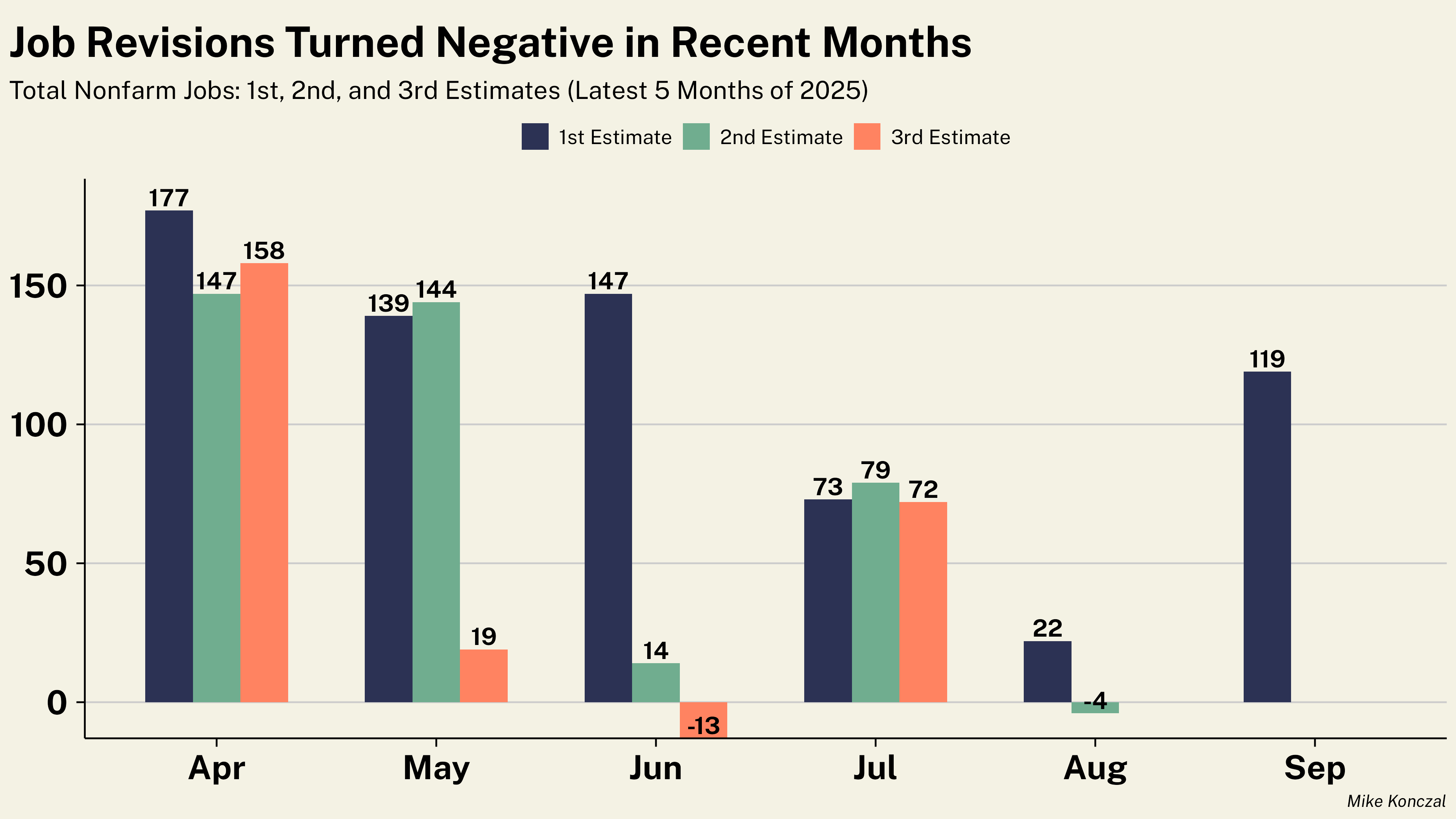 Yet, we’ve also seen the labor market weaken in the last several months, with, as you can see below, negative job growth in two out of the last four months. Other labor market measures are going south. It’s unclear whether this is because demand is falling or potential is, because of deportations and tariffs.