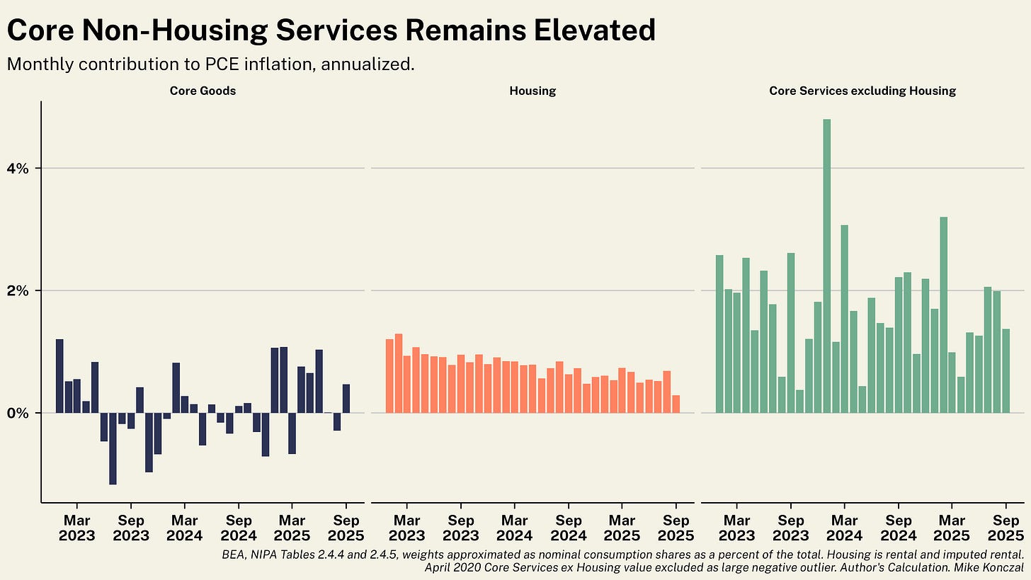 So what about this divisive vote? One implication of operating near the top end of an implicit range is that it creates sharp discontinuities in how different policymakers read the same data. A slightly different read puts you either inside or outside the range. Take the purple-colored box in the chart above, where over the past three months inflation is still in the ~2.8% range, but now it’s all in services, not goods. You can see this in the chart below. Normally you wouldn’t over-index on any three-month period. But we’re at the top-end of the range, making us more nervous about these short-term movements, so that’s why many want to hold.
