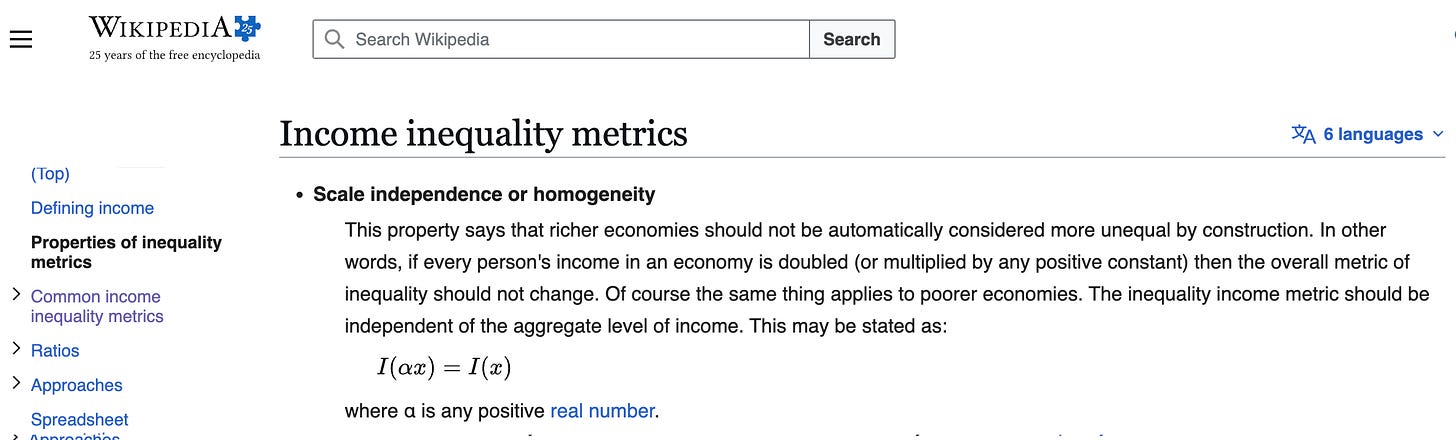 Economists are trained to think in ratios and how results change if they are multiplied by constants. Our inequality measures work this way. It’s also a stronger, key assumption built into macroeconomic theory, that if you double every price and every income then real variables shouldn’t budge. That is homogeneity of degree zero.