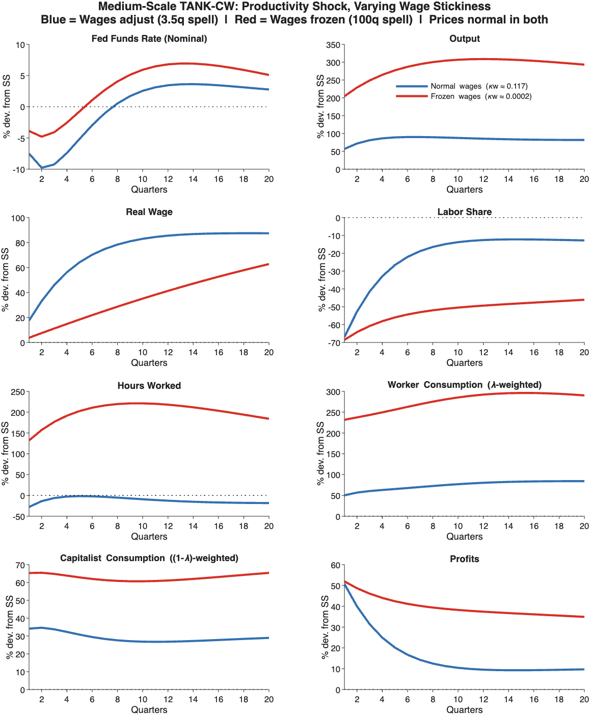 A two-agent New Keynesian (TANK) model splits the difference. The model I’m going to use is from “Workers, capitalists, and the government: fiscal policy and income (re)distribution” (2021) by Cristiano Cantore and Lukas B. Freund. They are kind enough to include their Dynare .mod files, which makes replication and modification straightforward, a huge plus. Cantore and Freund describe their model as “tractable laborator[y] for understanding various macroeconomic experiments,” which is exactly what we need.