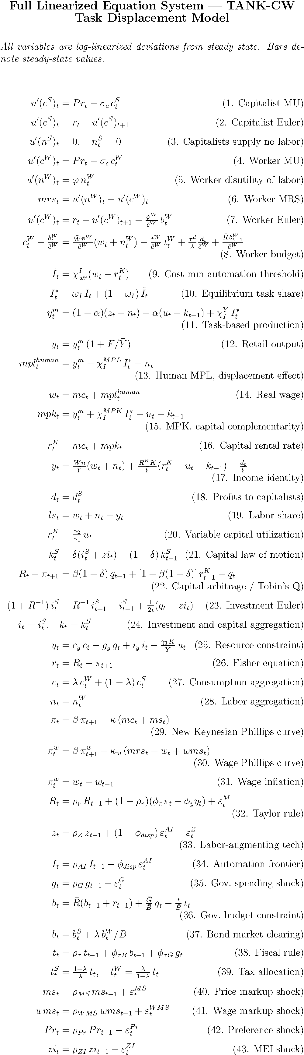 The simplest, representative-agent New Keynesian (RANK) model doesn’t get us very far. We need income distribution to matter for Citrini’s story, where workers have high marginal propensities to consume (MPCs), capital owners have lower MPCs, and shifting income from one to the other affects demand. At the same time, I don’t want us to get lost in the pyrotechnics of a full heterogeneous-agent New Keynesian (HANK) model, where a continuum of agents generates their own wealth distributions.