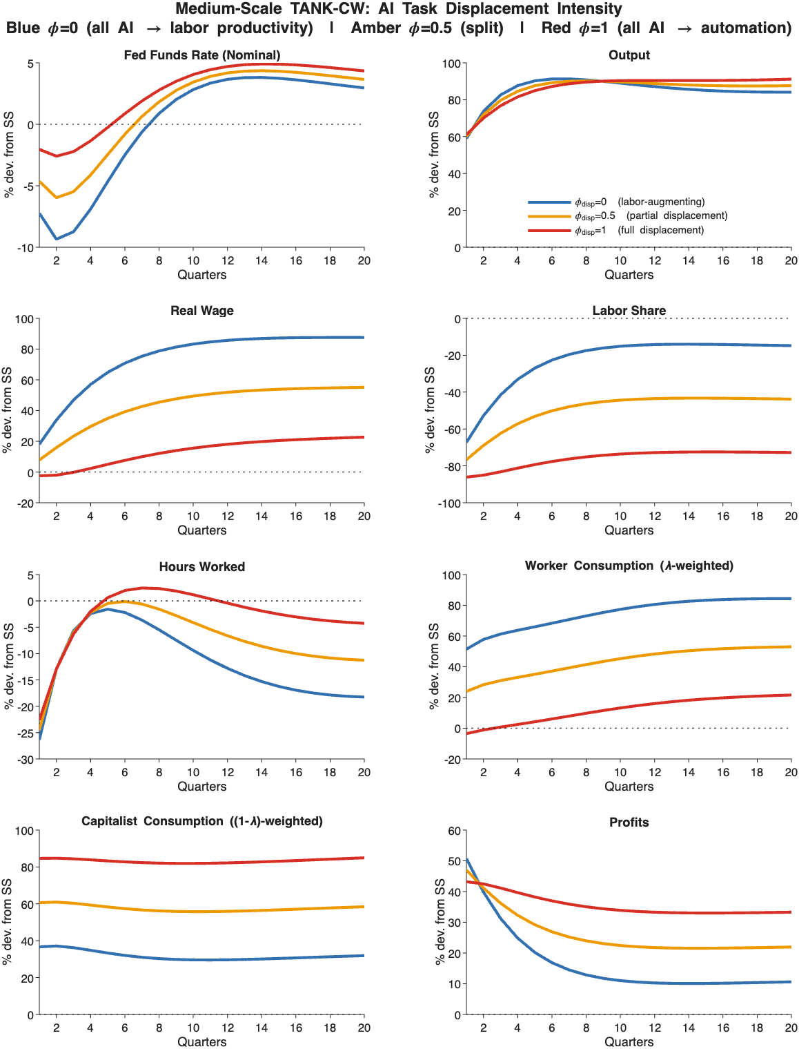 Interest rates: All three lines dip below zero, meaning the Fed cuts rates after the AI shock in each scenario. But the cut is dramatically larger under the blue scenario than the red one. This seems backwards. Shouldn’t we expect the scenario where the labor share falls to require deeper cuts?