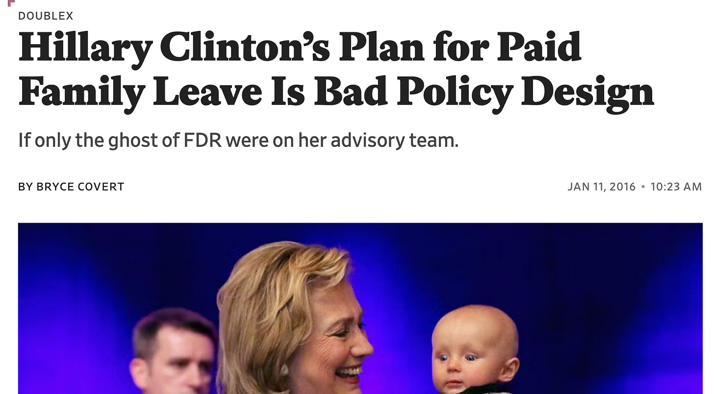 The writer Bryce Covert laid out the case against this in an important 2016 Slate piece, “Hillary Clinton’s Plan for Paid Family Leave Is Bad Policy Design“: