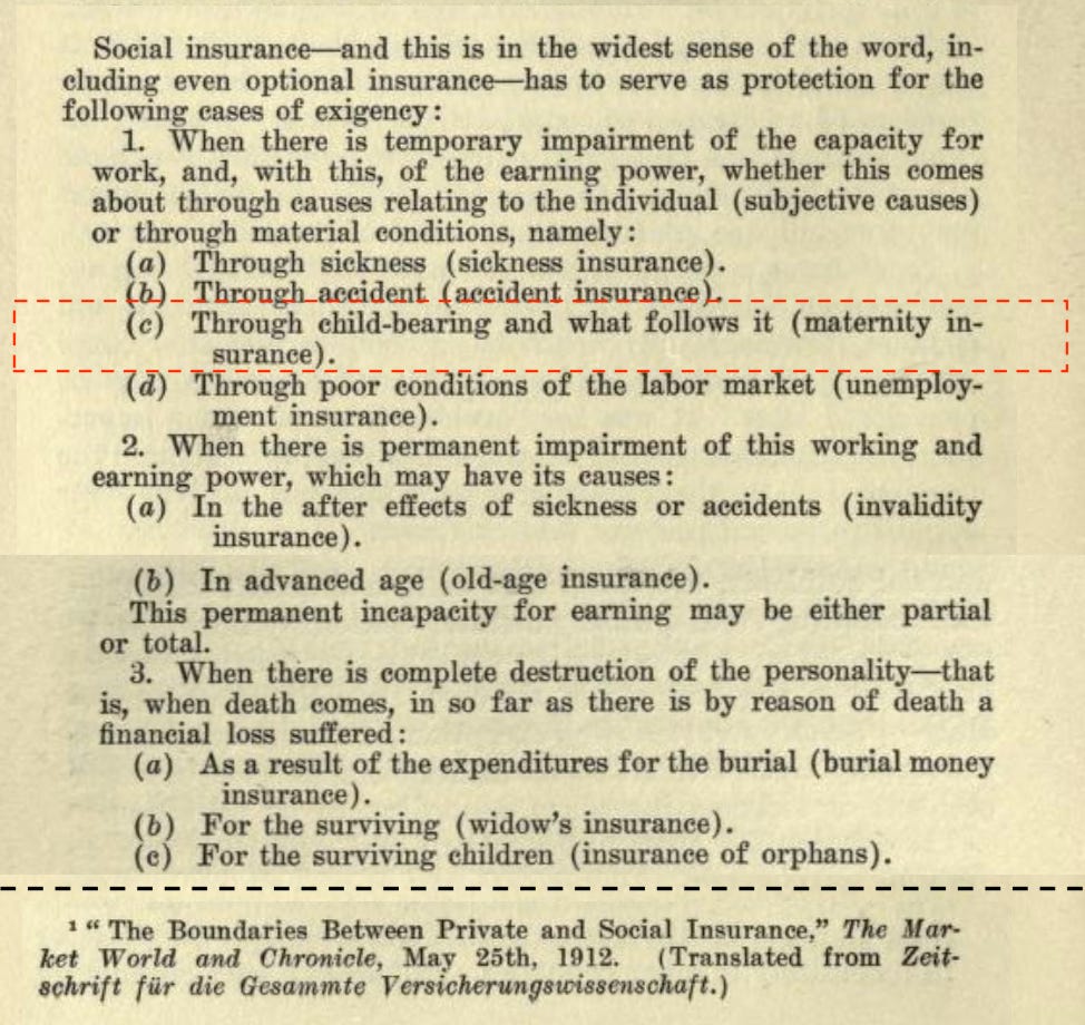 In his classic Social Insurance (1913), the first textbook on the topic published in the United States, the actuary I.M. Rubinow translated a 1912 German taxonomy of the types of social insurance, with my red text box flagging what we’d now call paid leave among all the important types: