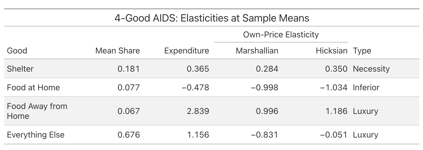 AIDS here is the Almost Ideal Demand System, a standard model in microeconomics for estimating how consumer spending shifts across goods when prices and incomes change. (Angus Deaton and John Muellbauer published their groundbreaking work in 1980, roughly two years before they would have named it literally anything else.) It generated this analysis: