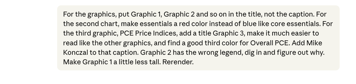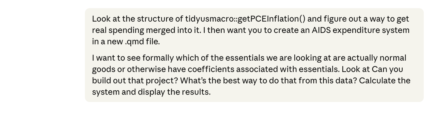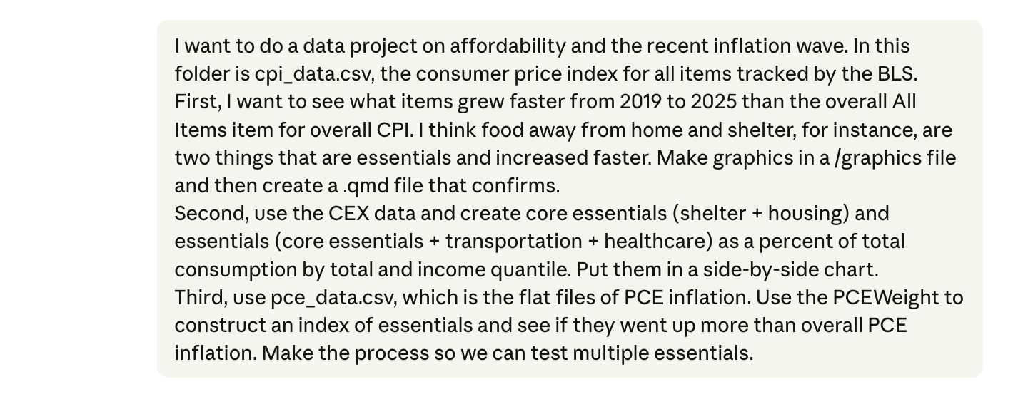 Last Monday, I published a blog post about the affordability crisis. Check it out! Near the beginning are three graphics I made on the price, spending, and indexing of essential items. To do this I created a folder on my desktop and dropped in the relevant data files. Then I gave this opening prompt: