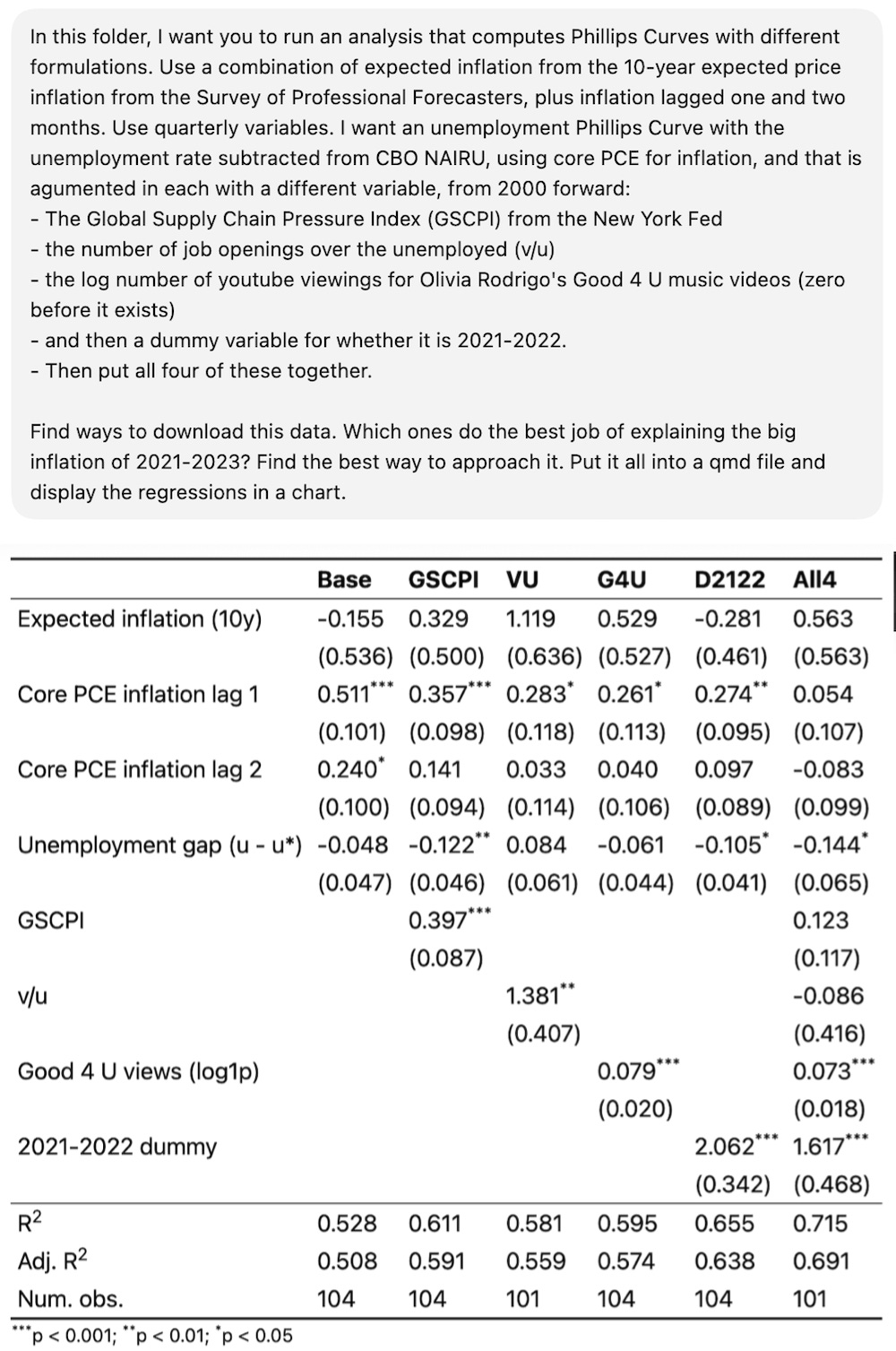 It got the data and did the analysis with one call.2 From the R-squared above, reflecting a few clean-up calls, Olivia Rodrigo does a better job estimating inflation than vacancies-to-unemployment. (The unit is log(good 4 u views + 1)). If you put them all together, only the dummy variable and the “good 4 u” variable are significant.