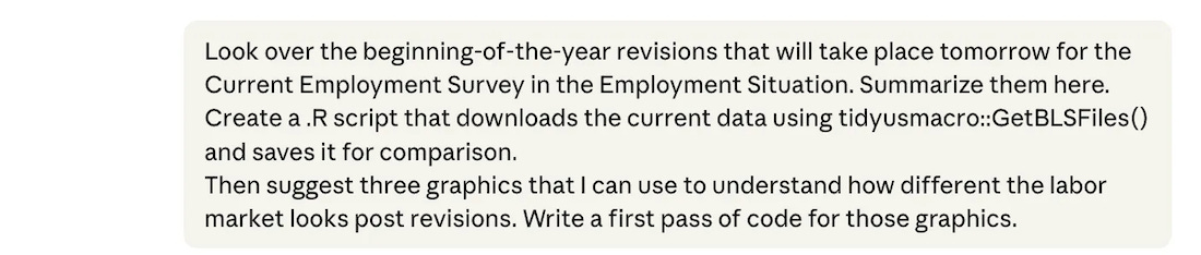My old workflow was that I’d take one or two hours the day before the major monthly data releases and manually code a few new graphics based on what I expected would be important. Maybe I post them or maybe I don’t, but they help me keep track of how the economy is moving, and they force me to think of new pieces I may have been missing.